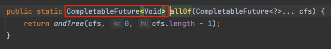 // null위와 같이 allOf() 결과를 직접 반환하진 않는다. 그리고 실제로 아래와 같이 메서드 시그니처를보면 CompletableFuture<Void>를 반환한다.