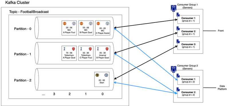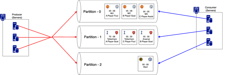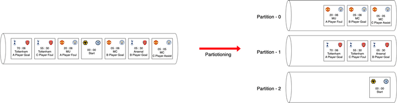 병렬적으로 축구 경기에 대한 이벤트를 처리하기위해선 사실상 논리적으로 Queue가 여러 개로 분산하여 처리되어야하며, 이렇게 분할하여 처리하는 기법을 파티셔닝이라한다.