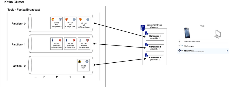 축구 사례를 다시 살펴보면, 아래와 같이 하나의 파티션당 컨슈머 그룹내 하나의 컨슈머가 할당되어 데이터를 꺼내간다.