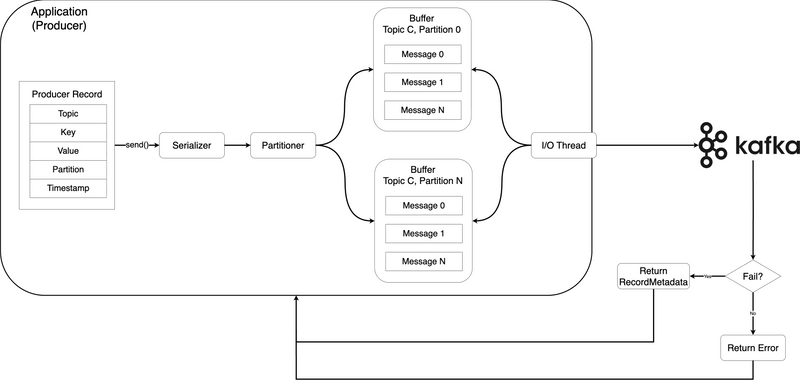 이때 파티션 번호를 지정할 수도 있으며, 파티션 번호를 지정하지 않으면 키에 따라 파티셔닝된다. 다시말해, 같은 파티션에 적재되어야하는 이벤트라면 동일한 키를 사용하도록해야 순서가 보장된다.