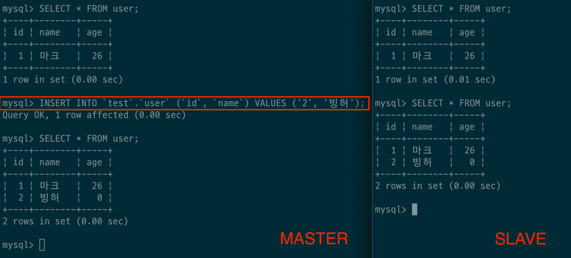 제대로 복제가 되었다면, 아래와 같이 Master에 쓰기 작업을 진행하면 자동으로 Slave에도 복제된다.