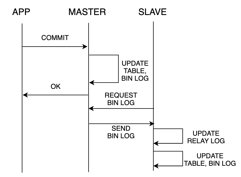 - 마스터 DB는 Transacntion 수행 중 슬레이브로 인한 추가적인 동작을 수행하지 않는다.