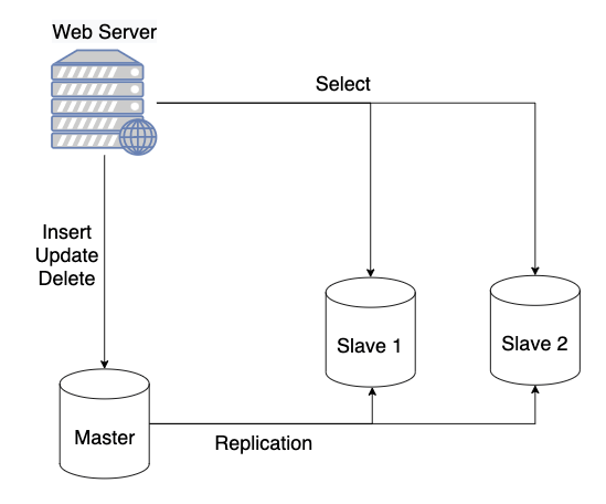 - 여러 개의 DB를 수직적인 구조(Master - Slave)로 구축하여, Master DB에선 쓰기 작업만을 수행하고, Slave DB들에선 읽기 작업만을 수행하는 방식